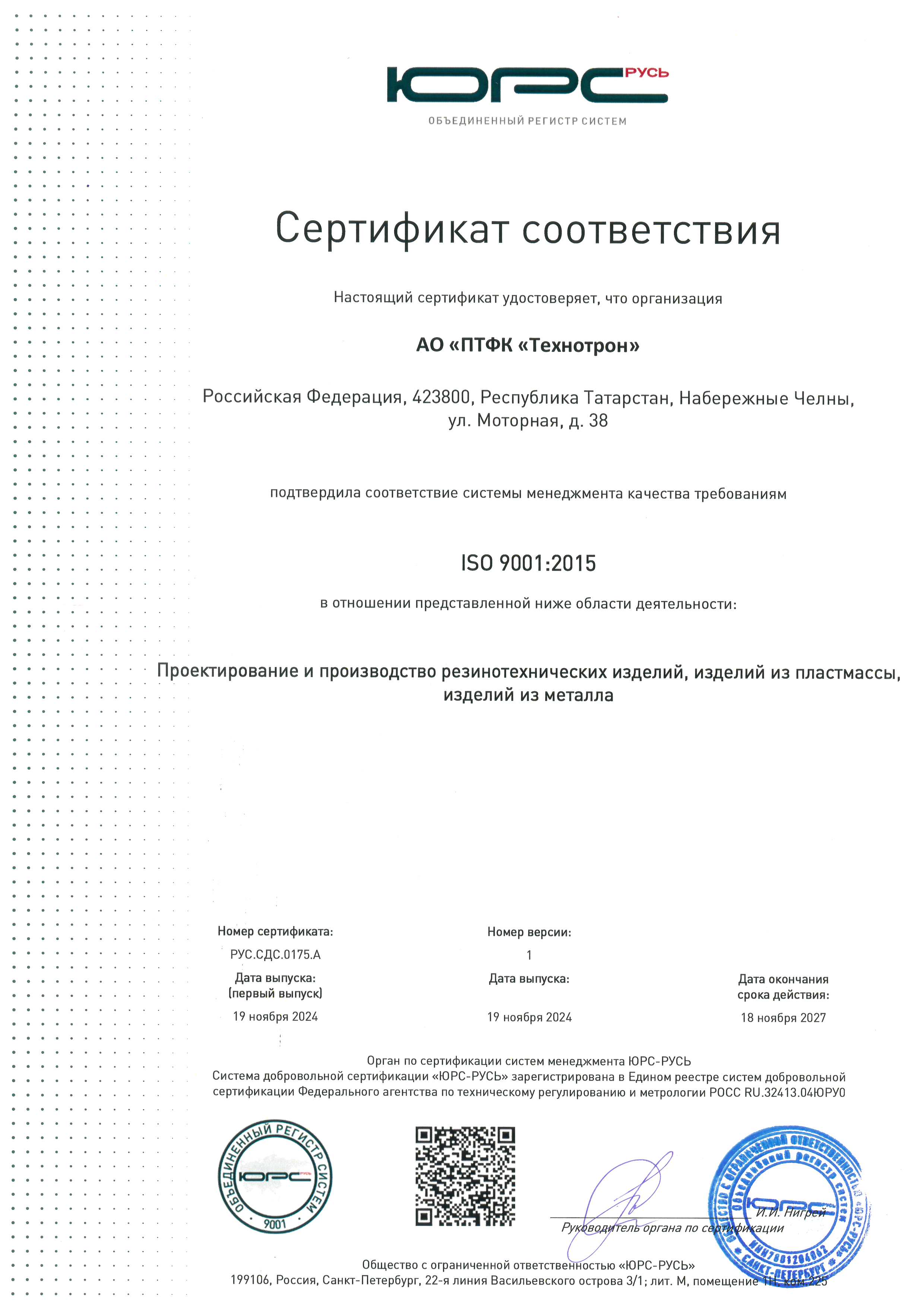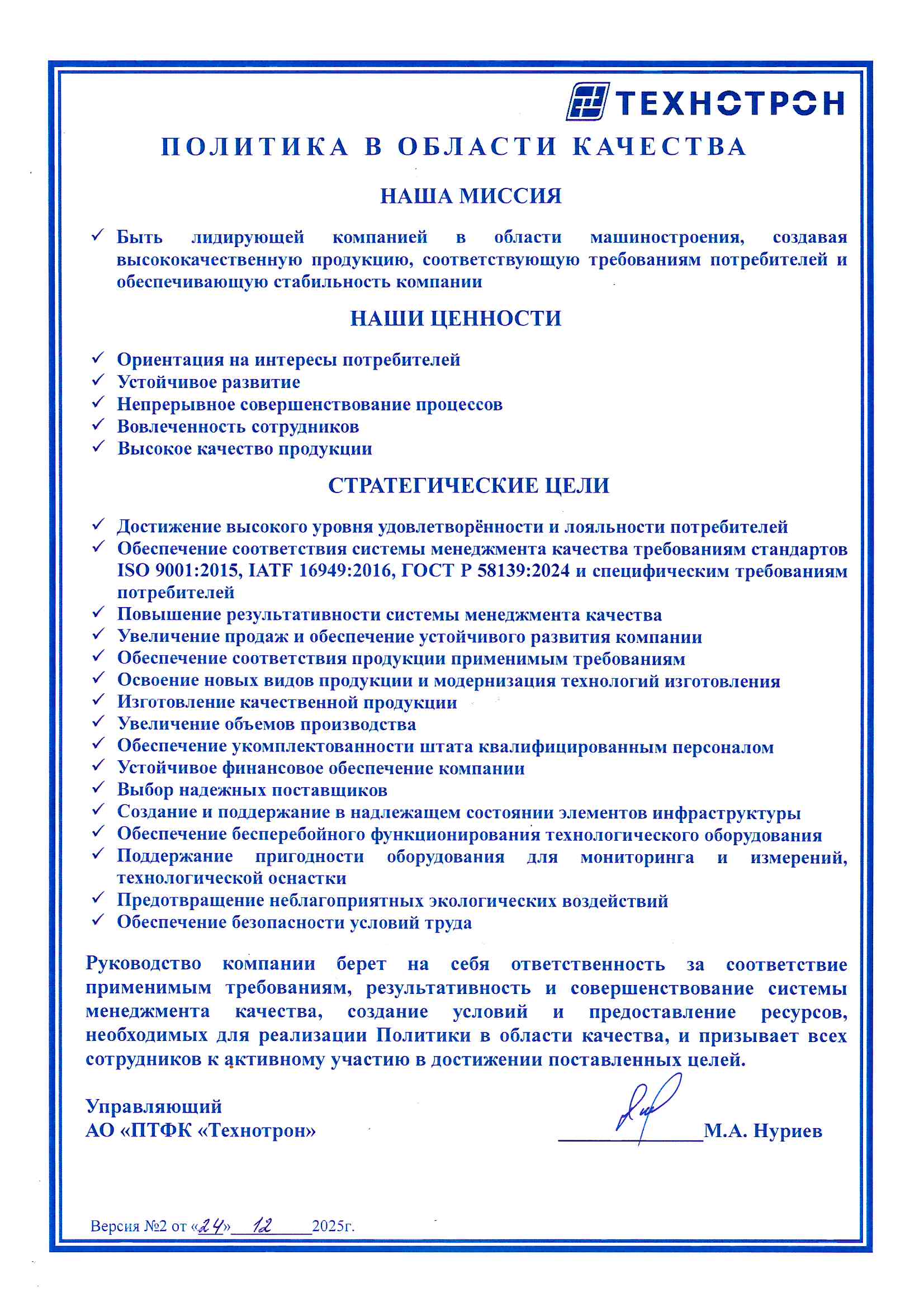 Четкое выполнение процессов системы менеджмента качества позволяет непрерывно повышать эффективность использования ресурсов и качество выпускаемой продукции. Отличные сырьевые ресурсы, современное производственное оборудование, квалифицированный персонал, строгий контроль культуры производства гарантирует высокое качество производимой продукции. Мы уделяем основное внимание качеству, качеству всей системы АО «ПТФК «Технотрон» в целом и каждому его компоненту.